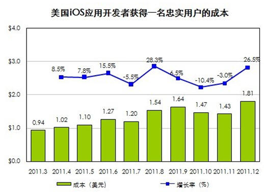 國(guó)際著名APP市場(chǎng)營(yíng)銷(xiāo)組織Fiksu最新的研究數(shù)據(jù)或許能出答案。2011年12月iOS應(yīng)用開(kāi)發(fā)者獲得一名忠實(shí)用戶(hù)的成本達(dá)到1.81美元,創(chuàng)下歷史新高。而在2011年第一季度,獲得一名用戶(hù)的平均成本為0.94美元,一年間單個(gè)用戶(hù)成本翻了一倍。當(dāng)用戶(hù)對(duì)蘋(píng)果商店里花樣繁多的游戲開(kāi)始麻木,就需要借助有針對(duì)性的推廣策略和強(qiáng)大的執(zhí)行,讓產(chǎn)品脫穎而出。如今忠實(shí)用戶(hù)成本的提高,使得幾乎所有開(kāi)發(fā)者乃至小團(tuán)隊(duì)都畏懼前期的市場(chǎng)推廣,大中型開(kāi)發(fā)公司可利用自身的資源循環(huán)造血拉動(dòng)用戶(hù),越是小的開(kāi)發(fā)團(tuán)隊(duì)成功的幾率就越渺茫,而被吞并的可能性則大增。