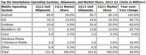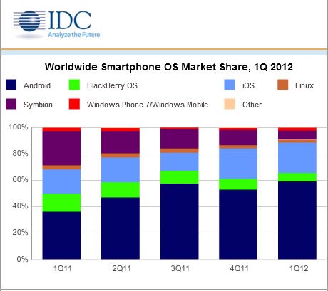 Android和蘋果的iOS繼續(xù)主導(dǎo)全球智能手機行業(yè),這兩個平臺的總出貨量占到2012年一季度所有智能手機出貨量的82%。其中Android手機以8900萬臺占據(jù)整個行業(yè)出貨量的59%,而蘋果以3510萬臺的出貨量占據(jù)23%的市場份額。這些數(shù)據(jù)均來自IDC的最新研究報告。36氪