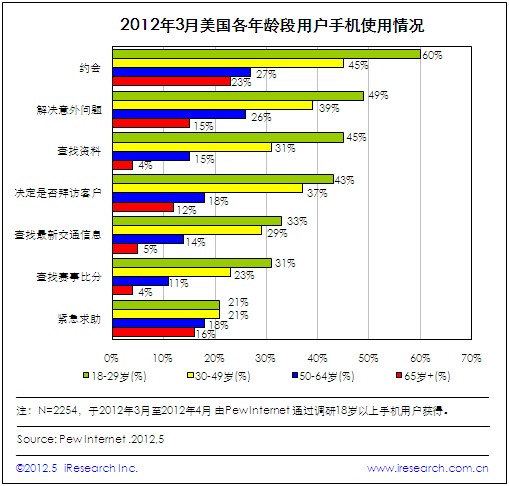 iResearch艾瑞咨詢根據(jù)Pew Internet 2012年5月發(fā)布的數(shù)據(jù)整理發(fā)現(xiàn),美國各年齡段手機用戶中,18-29歲的用戶使用手機程度最為頻繁,主要用于“約會”“解決意外問題”及“查找資料”上。相比其他年齡段用戶群,年輕用戶更偏向利用移動手機來獲取信息。艾瑞網(wǎng)