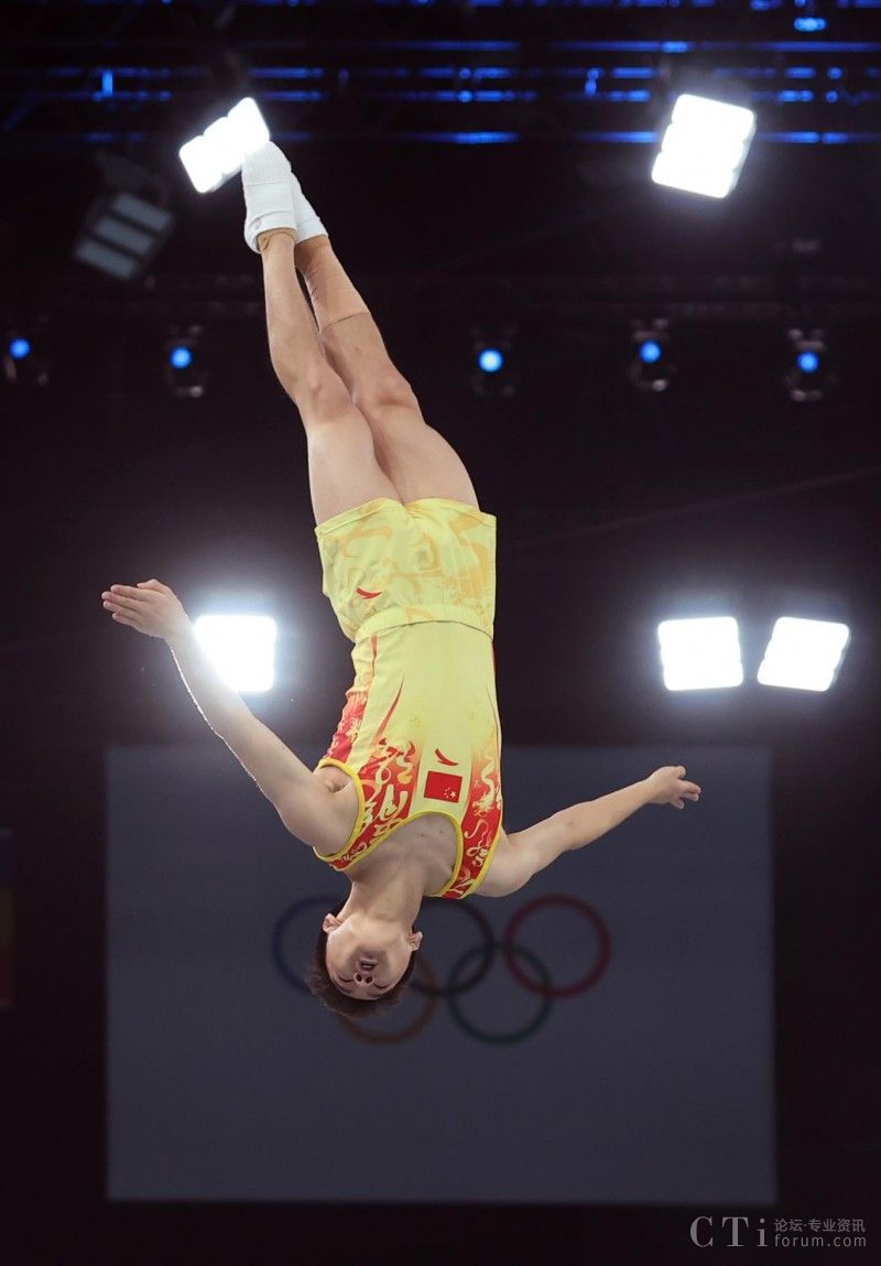 8月2日,中國(guó)選手王梓賽在比賽中。當(dāng)日,巴黎奧運(yùn)會(huì)蹦床項(xiàng)目男子預(yù)賽在貝爾西體育館舉行。新華社記者 曹燦 攝