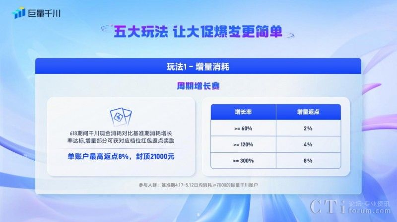 一、「周期增長賽」:針對(duì)在618好物節(jié)期間現(xiàn)金消耗對(duì)比基準(zhǔn)期消耗增長率達(dá)標(biāo)的商家,增量部分可獲得對(duì)應(yīng)檔位紅包返點(diǎn)獎(jiǎng)勵(lì),單賬戶最高返點(diǎn)8%,封頂21000元。