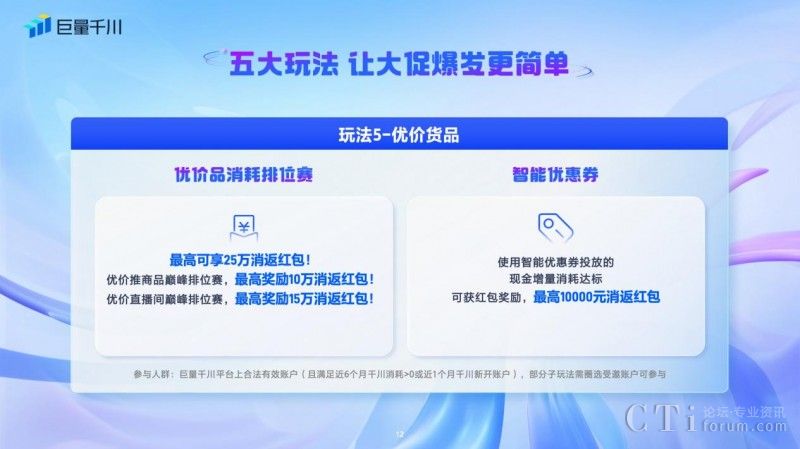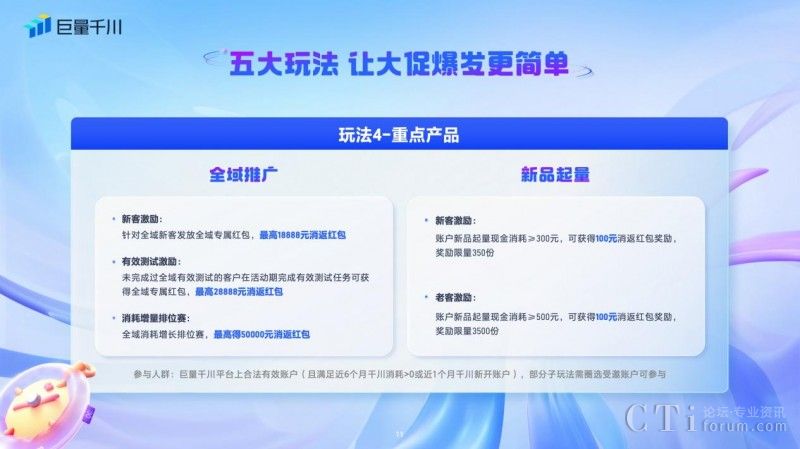四、「重點(diǎn)產(chǎn)品玩法」:「全域推廣」和「新品起量」兩個(gè)巨量千川平臺(tái)重點(diǎn)產(chǎn)品,也推出了系列玩法。全域推廣對(duì)新客、完成有效測試的客戶發(fā)放全域推廣專屬紅包,最高達(dá)28888元,參與全域增長消耗排位賽也可獲得高達(dá)50000元的消返紅包。新品起量基準(zhǔn)期新客現(xiàn)金消耗≥300元,可獲得100元消返紅包獎(jiǎng)勵(lì),老客現(xiàn)金消耗≥500元,即可得到100元消返紅包獎(jiǎng)勵(lì)。