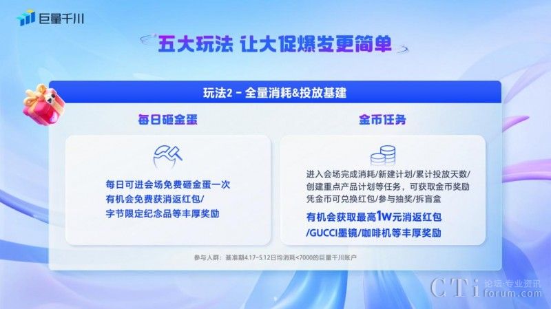 二、「每日砸金蛋&金幣任務(wù)」:針對(duì)在618好物節(jié)期間現(xiàn)金消耗對(duì)比基準(zhǔn)期消耗增長率未達(dá)標(biāo)的商家,可參與每日砸金蛋和金幣任務(wù)。商家每日可進(jìn)入會(huì)場免費(fèi)砸金蛋一次,就有機(jī)會(huì)免費(fèi)獲得消返紅包和字節(jié)限定紀(jì)念品等獎(jiǎng)勵(lì)。此外,商家進(jìn)入會(huì)場完成消耗/新建計(jì)劃/累計(jì)投放天數(shù)/創(chuàng)建重點(diǎn)產(chǎn)品計(jì)劃等任務(wù),可獲取金幣獎(jiǎng)勵(lì),憑金幣可兌換紅包、參與抽獎(jiǎng)和拆盲盒等豐厚獎(jiǎng)勵(lì),最高可得10000元消返紅包。