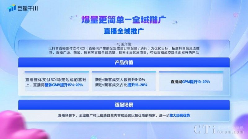 獲取生意增量是商家生意經(jīng)營的重中之重,升級(jí)后的全域推廣分為直播全域推廣和商品全域推廣,讓爆量變得更簡單。直播全域推廣打通廣告和自然流量,以抖音直播整體ROI為優(yōu)化目標(biāo),拓展抖音信息流推薦、直播廣場、商城、搜索等直播全域流量,帶動(dòng)直播成交額全面提升,放大直播生意,直播間整體GMV提升15%~20%,新客/新粉成交占比提升15%~20%。