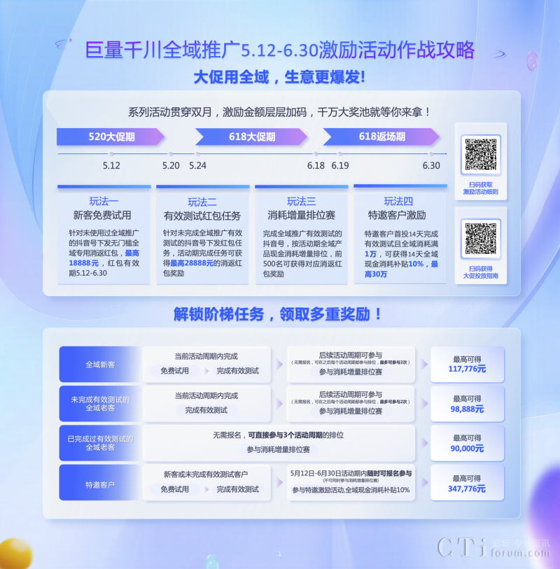 在此次巨量千川618好物節(jié)期間,全域推廣系列活動(dòng)貫穿雙月,激勵(lì)金額層層加碼,更有多重獎(jiǎng)勵(lì),獎(jiǎng)池金額累積千萬。全域推廣針對(duì)全域新客發(fā)放高達(dá)18888元的全域推廣專屬紅包;對(duì)于未完成全域有效測試的商家在活動(dòng)期完成有效測試任務(wù)可獲得最高28888元的消返紅包;以及參與全域推廣消耗排位賽,最高可得50000元消返紅包;對(duì)于特邀客戶首投14天完成有效測試且全域消耗滿1萬,可獲得14天全域現(xiàn)金消耗補(bǔ)貼10%,最高達(dá)30萬。