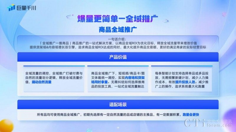 此外,商品全域推廣為商品推廣提供一站式解決方案,是以商品全域ROI為優(yōu)化目標(biāo),釋放全域流量帶來的增效價(jià)值,提供貨架場、內(nèi)容場增長雙引擎,幫助客戶在追求商品全域ROI達(dá)成的同時(shí),最大化提升商品交易額,更好的滿足客戶的實(shí)際經(jīng)營目標(biāo)。在商品全域推廣下,短視頻/商品卡/圖文體裁統(tǒng)一調(diào)控,無需糾結(jié)選擇推廣商品的投放工具,一站式全域流量觸達(dá)。