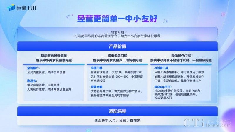 針對(duì)中小商家經(jīng)營長效問題,巨量千川打造簡單易用的電商營銷平臺(tái)。撬動(dòng)多元場景流量,解決中小商家獲量難題;降低資金門檻,解決資金少、周轉(zhuǎn)難的問題;降低素材制作操作門檻,解決商家“不會(huì)投”、“不敢投”的難題,讓經(jīng)營更簡單。