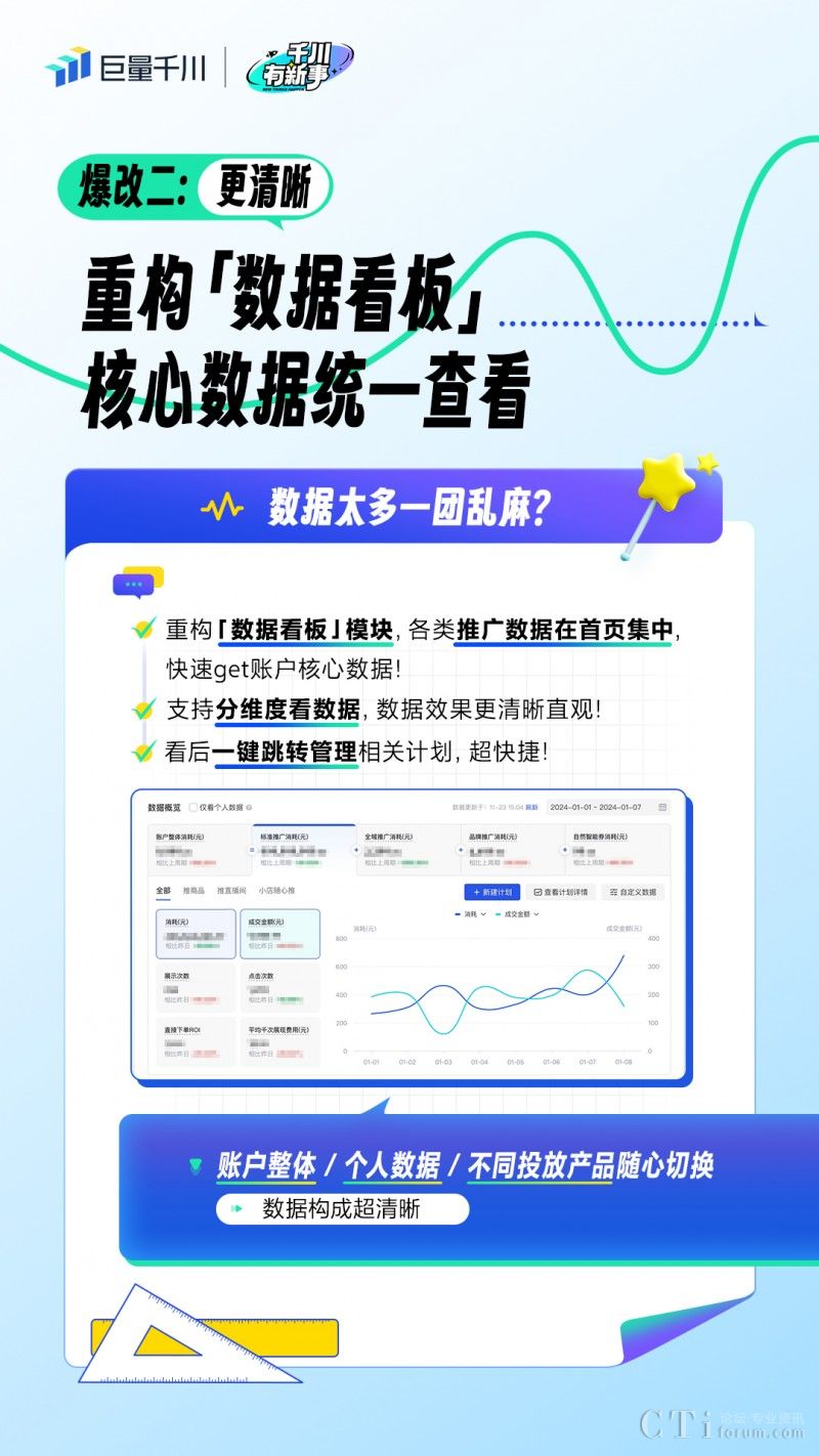 新升級(jí)的巨量千川首頁(yè)通過(guò)重構(gòu)「數(shù)據(jù)看板」,將重要的推廣數(shù)據(jù)集中在首頁(yè),同時(shí)還支持分維度查看不同數(shù)據(jù)及趨勢(shì)變化,讓商家更清晰地看到數(shù)據(jù)背后的投放、經(jīng)營(yíng)效果。