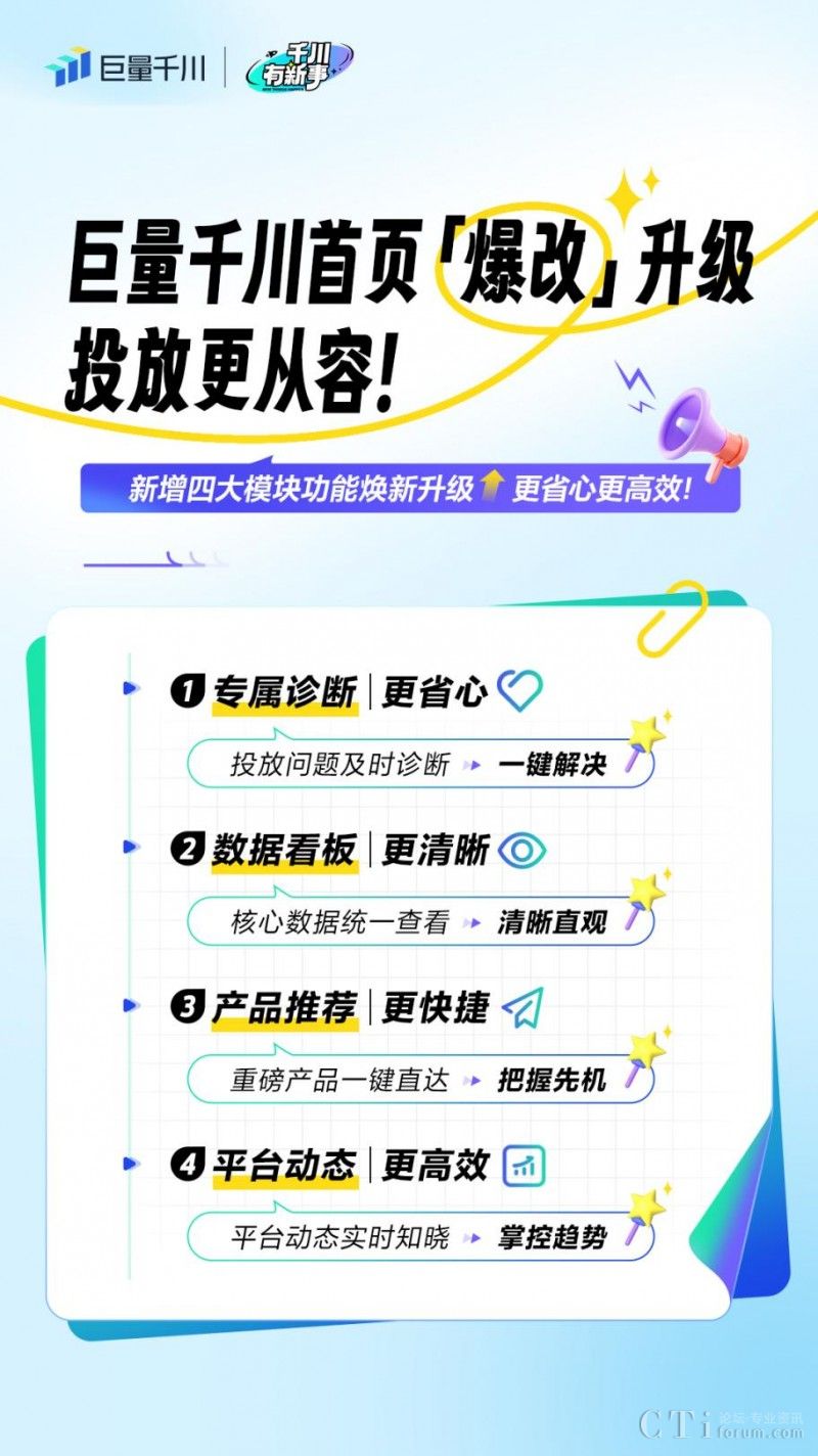 近期,為直面商家投放困境,全面提升投放效率,巨量千川PC端首頁(yè)全新推出四大重磅升級(jí)——上線「專屬診斷建議」、「數(shù)據(jù)看板」、「重磅產(chǎn)品推薦」和「平臺(tái)動(dòng)態(tài)」,助力商家更便捷、更從容地提升投放質(zhì)量和效果,高效推動(dòng)生意增長(zhǎng)!