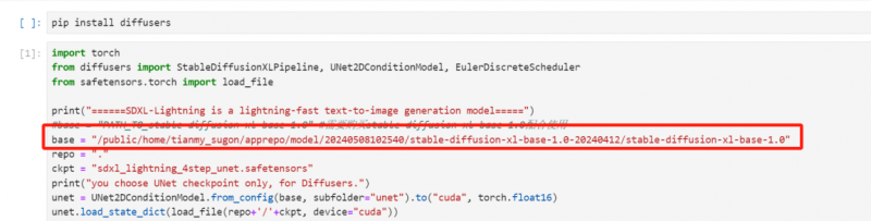 第三步,商城首頁中選擇 SDXL-Lighting 系列模型商品,免費購買后點擊“一鍵試用”。進入notebook頁面后選擇“Python3.9”內(nèi)核,將第二步復制路徑粘貼到代碼的 base 變量中,點擊保存。