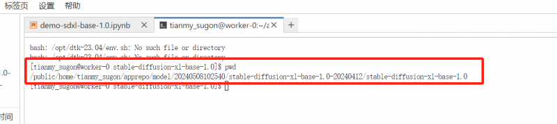 第二步,在終端頁面輸入“pwd”,查看并復制 stable-diffusion-xl-base-1.0 模型路徑。