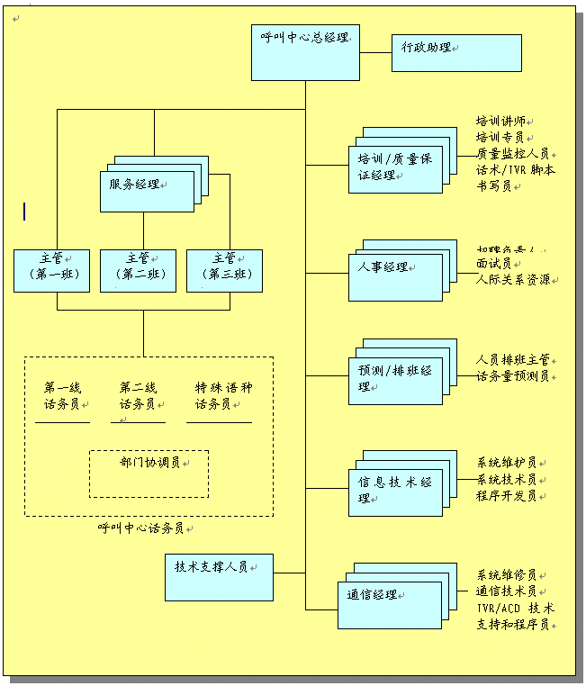 呼叫中心組織結(jié)構(gòu)概述了中心的任務(wù)和職責(zé)。對組織進行了統(tǒng)籌安排以便中心能有效達(dá)到工作目標(biāo),組織安排主要有: