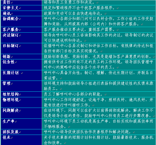 根據(jù)呼叫中心的具體需要,還可以包括許多其他要素。建議在制訂員工滿意度調(diào)查表時結(jié)合組織人員關(guān)系,組織管理、收集和報告結(jié)果和趨勢。這有助于員工確信調(diào)查過程、調(diào)查結(jié)果及其對今后提高的影響。