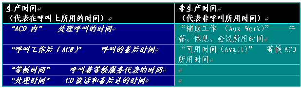 如果工作狀態(tài)最佳,代表的工作目標為80%的時間用在呼叫上,其余為非生產時間。主管運用ACD報告結合第一手調查資料考察這些工作所用的時間。