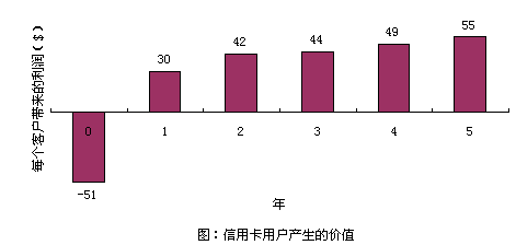 以信用卡服務(wù)為例,爭取一個(gè)新的用戶平均要51美圓,用于廣告、推銷和開戶等開支。用戶開始時(shí)花錢很少,但為公司帶來一定的利潤。但如果用戶繼續(xù)使用到第二年,就會(huì)為公司帶來更多的經(jīng)濟(jì)效益,因?yàn)楣九c客戶之間的信任和客戶對公司的滿意,致使客戶更多地通過信用卡消費(fèi)。(圖:"信用卡用戶產(chǎn)生的價(jià)值")用戶貢獻(xiàn)在增加,公司的運(yùn)作費(fèi)用卻在不斷減低。信用卡公司可以不斷減少對客戶信用的審核時(shí)間。保持長期的客戶關(guān)系,還可以減少廣告支出,客戶本身就是一個(gè)免費(fèi)的廣告資源。很多人在消費(fèi)前喜歡聽取朋友的意見,覺得比廣告更可信。
