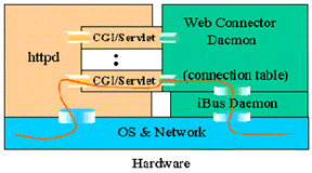 所有來自客戶端的請(qǐng)求(瀏覽器和Applet)都首先發(fā)送給Web Server(HTTP Daemon),然后由httpd啟動(dòng)相應(yīng)的CGI/servlet擴(kuò)展,CGI/servlet模塊僅對(duì)上傳的數(shù)據(jù)進(jìn)行簡(jiǎn)單的檢查和打包工作然后就傳給Web Connector Daemon,CGI/servlet模塊本身并不處理連接,它是以一種無連接的方式轉(zhuǎn)發(fā)一個(gè)請(qǐng)求再回送應(yīng)答。連接的維持和記錄由Web Connector Daemon建立起連接記錄表來完成。