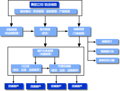 可以通過銷售統(tǒng)計查詢某個產(chǎn)品、某地區(qū)的下級分銷商、到某個下級分銷商的銷售情況,還可形成周/月報表。