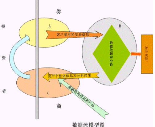 。。在整個的數(shù)據(jù)流循環(huán)模型中,可以分為三個模塊:A模塊,客戶通過交易通道進行投資活動;B模塊,根據(jù)客戶的基本信息和交易信息,進行大量的數(shù)據(jù)挖掘和數(shù)據(jù)分析,為領導決策進行支持,并且得到客戶的個性化信息和各種分析結(jié)果;C模塊,根據(jù)各種數(shù)據(jù)的分析結(jié)果,同時根據(jù)投資咨詢師手中現(xiàn)有的信息產(chǎn)品,為客戶提供真正的個性化的咨詢服務,并且把此個性化的咨詢服務即時傳遞給投資者,為客戶進行下一次的投資活動而準備。