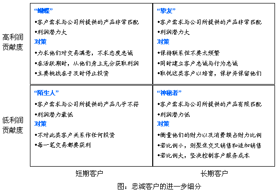 CRM廠商和業(yè)界普遍認(rèn)為:只要贏得了客戶的忠誠,企業(yè)將"財源滾滾";因此企業(yè)在培養(yǎng)客戶忠誠方面的開支在逐步上升。因?yàn)閺谋砻嫔峡磥恚蛻魸M意度、客戶忠誠度和客戶保留度越高,客戶利潤貢獻(xiàn)度就大。但事實(shí)并不如他們所愿,《哈佛商業(yè)評論》最新的論文,研究表明:客戶滿意度、客戶忠誠度與客戶利潤貢獻(xiàn)度的關(guān)聯(lián)程度比預(yù)期的要小得多。企業(yè)應(yīng)當(dāng)對忠誠客戶再進(jìn)行細(xì)分,然后在更細(xì)化的客戶基礎(chǔ)上對其進(jìn)行分類管理,并采取相應(yīng)的對策。在論文中,作者根據(jù)利潤貢獻(xiàn)度大小與客戶的短長期兩個維度,將忠誠客戶進(jìn)行了深層次細(xì)分。主要分成四類:"蝴蝶"、"摯友"、"陌生人"、"神秘者"。企業(yè)應(yīng)該根據(jù)每一類的情況采取相應(yīng)的對策。管理那些能使企業(yè)盈利但不忠誠的客戶--"蝴蝶"--的關(guān)鍵是,在他們購物時盡可能地從他們身上獲利。對那些既能帶來利潤又忠誠的客戶--"摯友",細(xì)心呵護(hù)他們則更為恰當(dāng)。至于那些忠誠但不能帶來利潤的客戶--"藤壺",你需要做的是確定他們是否有增加消費(fèi)的潛力。最后,對于"陌生人"--那些既不忠誠又沒有利潤可賺的客戶,答案當(dāng)然很簡單:早點(diǎn)認(rèn)出他們,不對他們做任何投資。