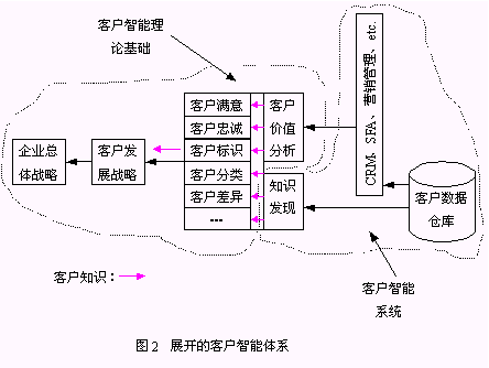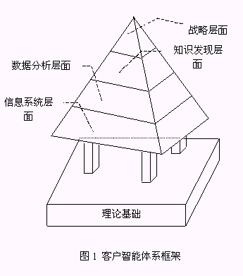 客戶智能系統(tǒng)(CI System)是本文提出的實現(xiàn)客戶智能的系統(tǒng)平臺。它包括了客戶智能體系中的信息系統(tǒng)層面、數(shù)據(jù)分析層面、知識發(fā)現(xiàn)層面,是基于客戶智能理論的可操作的系統(tǒng)框架。因此,客戶智能體系也可以簡單地用客戶智能基礎理論和基于客戶智能理論的客戶智能系統(tǒng)兩個邏輯層面表示(圖2);诳蛻糁悄艿腃RM系統(tǒng)是本文描述的客戶智能系統(tǒng)中的一種。