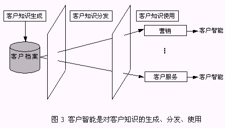 客戶知識是人們通過實踐認識到的、與客戶有關的規(guī)律性,而客戶智能是獲得客戶知識并使用客戶知識求解問題的能力?蛻糁悄苁菍ζ髽I(yè)戰(zhàn)略決策真正有價值的事物和行動?蛻糁悄懿粌H包括了客戶知識的生成,而且更強調(diào)了客戶知識在企業(yè)中的分發(fā)、使用,直到產(chǎn)生客戶智能。所以,客戶智能是對客戶知識的生成、分發(fā)和使用(圖3)。