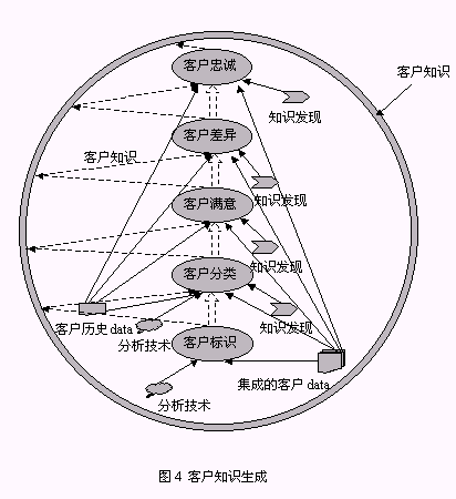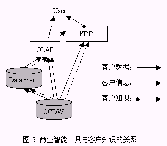 從以上構(gòu)成系統(tǒng)的三個組件的介紹中同時可以找到對以下兩個問題的答案:1、客戶數(shù)據(jù)、客戶信息、客戶知識之間的區(qū)別(圖5):由來自于事務系統(tǒng),如ERP、SFA等的源數(shù)據(jù)經(jīng)整理后放入CCDW或數(shù)據(jù)集市,這一過程處理的對象稱為客戶數(shù)據(jù);OLAP為決策人員提供了展示有意義的客戶數(shù)據(jù)的機制,這種有意義的客戶數(shù)據(jù)稱之為客戶信息;客戶數(shù)據(jù)和客戶信息均可以通過KDD技術(shù)的運用,提升為對決策有價值的客戶知識。2、客戶知識生成的途徑:從對第一個問題的解答中可以知道,客戶知識從KDD作用的對象來看有兩種途徑:KDD作用于客戶數(shù)據(jù)、KDD作用于客戶信息,總之,客戶知識生成是依賴于KDD過程的復雜的過程。