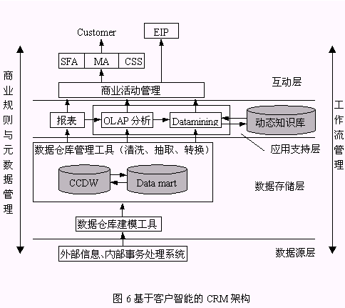 圖6是本文給出的以客戶智能為核心的I-CRM系統(tǒng)架構(gòu)。從數(shù)據(jù)源層來的客戶數(shù)據(jù)經(jīng)過ETL(抽取、轉(zhuǎn)換、裝載)、清洗后以數(shù)據(jù)存儲層的CCDW或數(shù)據(jù)集市的形式存儲。應用支持層是提供了報表查詢、OLAP、知識發(fā)現(xiàn)分析決策工具,作用于客戶數(shù)據(jù),該過程產(chǎn)生的有價值的客戶知識存儲于動態(tài)知識庫中;訉犹峁┝薎-CRM利用客戶知識從而有效實施其功能的場所。該架構(gòu)具有以下特點: