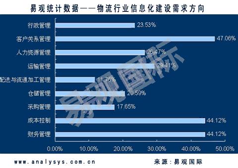 易觀國際《中國物流行業(yè)信息化年度綜合報告2006》數(shù)據(jù)統(tǒng)計,物流企業(yè)選擇管理信息化建設(shè)方向最迫切的需求是客戶關(guān)系管理,占到全部企業(yè)的47%以上。圖:物流行業(yè)信息化建設(shè)需求方向