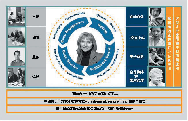 mySAP CRM不僅包含了企業(yè)市場營銷、銷售、服務(wù)、分析等功能,還通過渠道伙伴、現(xiàn)場和移動(dòng)商務(wù)、交互中心、電子商務(wù)等各種交互渠道形成完整的閉環(huán)式設(shè)計(jì)的解決方案。在提供深入的行業(yè)應(yīng)用和傳統(tǒng)的部署方式的同時(shí),mySAP