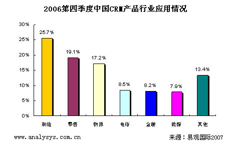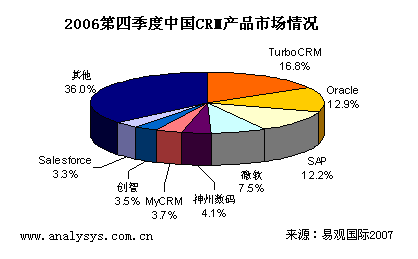 易觀國(guó)際研究表明,中國(guó)CRM產(chǎn)品市場(chǎng)2006年第4季度總體市場(chǎng)規(guī)模達(dá)到0.81億人民幣,季度增長(zhǎng)率達(dá)到4.2%,體現(xiàn)了穩(wěn)健增長(zhǎng)的趨勢(shì)。具體廠(chǎng)商方面,TurboCRM,Oracle(甲骨文),SAP位居領(lǐng)先地位。易觀網(wǎng)