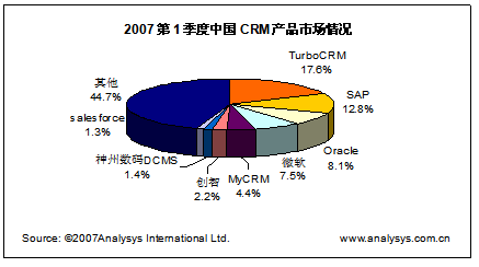 易觀國際研究表明,中國CRM產(chǎn)品市場2007年第1季度總體市場規(guī)模達(dá)到0.79億人民幣,同比季度增長率達(dá)達(dá)到13%,體現(xiàn)了穩(wěn)健增長的趨勢。具體廠商方面,TurboCRM,SAP,Oracle(甲骨文)位居領(lǐng)先地位。易觀網(wǎng)