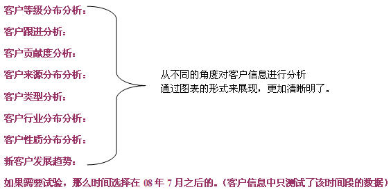 - 客戶分析:根據(jù)客戶管理的進程,多方位多角度的分析客戶的構成、發(fā)展、進程、貢獻等,幫助企業(yè)快速響應客戶的需求,有價值的關懷客戶,使企業(yè)客戶關系管理建立起一套科學的體系。