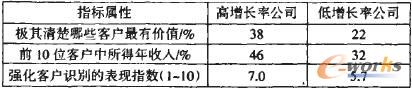 對《財富》雜志排名前l(fā)000位公司的200位經(jīng)理調(diào)查后得出結(jié)論,企業(yè)增長性與清楚的識別客戶有明顯的聯(lián)系(見表1)。該表反映了高增長率的企業(yè)比低增長率的企業(yè)更加懂得客戶識別的重要性,并運(yùn)用技巧來強(qiáng)化核心客戶為企業(yè)創(chuàng)造更多價值。