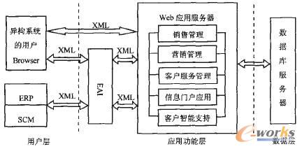 包括ERP、SCM等其他企業(yè)應(yīng)用在內(nèi)的所有的系統(tǒng)用戶與應(yīng)用功能層的數(shù)據(jù)交換均通過XMI數(shù)據(jù)進(jìn)行傳輸,從而大大減小了各種企業(yè)應(yīng)用系統(tǒng)間的通信阻力,為EAI提供了良好的通信平臺。Web用戶的客戶端只是“瘦小的”瀏覽器日_數(shù)量不受限制,不需要安裝專門的軟件,這使得凡可以接入Internet的用戶都可以方便、靈活地使用系統(tǒng),大大提升了系統(tǒng)用戶間溝通、協(xié)作的效率。此外,由于CRM應(yīng)用系統(tǒng)是在中央服務(wù)器上實(shí)施和維護(hù)的,對客戶端的要求遠(yuǎn)沒有C/S結(jié)構(gòu)那么高,集中的軟件實(shí)施和維護(hù)大大節(jié)約了企業(yè)的運(yùn)行成本和維護(hù)費(fèi)用。圖1描述的是筆者所要闡述的適應(yīng)網(wǎng)絡(luò)環(huán)境的基于Web的系統(tǒng)平臺架構(gòu),這并不意味著CRM應(yīng)用系統(tǒng)完全以這種方式運(yùn)行,事實(shí)上用戶接入CRM系統(tǒng)的方式是多種多樣的,系統(tǒng)還應(yīng)該提供電話、傳真、無線接入等多種接入接口。