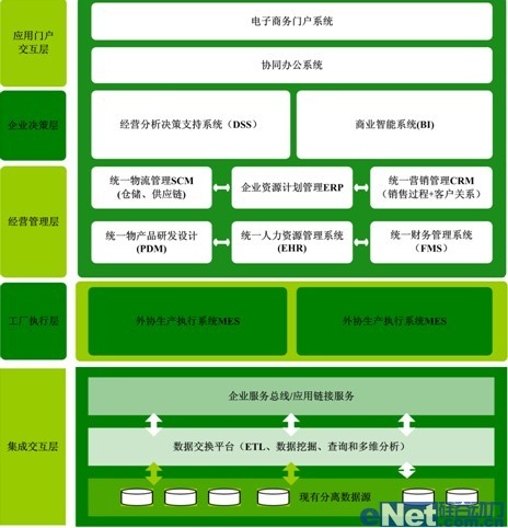 根據企業(yè)管理發(fā)展戰(zhàn)略及目標,需要考慮建設“集成化數字管控制造系統(tǒng)”,涵蓋企業(yè)決策層、企業(yè)經營管理層。根據整體業(yè)務模式,企業(yè)經營管理層又可以進一步分解為公司管理層和工廠執(zhí)行層;從信息化戰(zhàn)略支撐角度可以分解為企業(yè)門戶交互層、應用系統(tǒng)層、應用集成層和網絡支撐層。實現企業(yè)信息流、資金流、物流、商物流的高度集成、統(tǒng)一,為企業(yè)生產、經營提供強有力的信息化支撐。