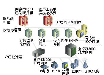 8200 IP傳真服務器等。中間層通過協(xié)議適配解決通用信令問題,并且提供網(wǎng)絡和服務管理。第一層包含Total Control 1000介質(zhì)網(wǎng)關(guān),它通過多種訪問網(wǎng)絡將不同類型的業(yè)務量綜合在一起。
