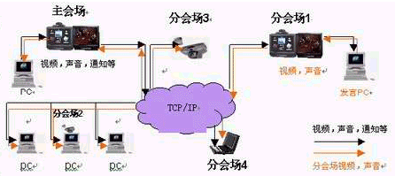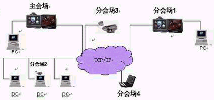 可視化Ip電話會議系統(tǒng): 是利用計算機,多媒體通信技術和設備,通過傳輸信道在兩地或多個地點之間開會的一種通信手段。在召開會議時,處于兩地或不同地點的與會代表,既可以聽到對方的聲音,又可以看到對方的形象,同時還能看到對方會議室的場景,以及在會議中展示的事物、圖片、表格、文件等,縮短了與會代表的距離,使大家好像在同一會議室參加會議一樣。它的廣泛應用必然產(chǎn)生巨大的社會效益和經(jīng)濟效益。系統(tǒng)結(jié)構簡圖如下: