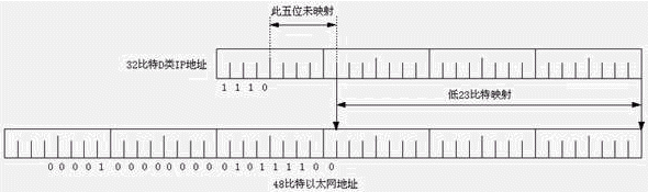 D類地址的最后28比特沒有結(jié)構化,即沒有網(wǎng)絡ID和主機ID之分。響應某一個IP多播地址的主機構成一個主機組,主機組可跨越多個網(wǎng)絡。主機組的成員數(shù)是動態(tài)的,主機可以通過IGMP協(xié)議加入或離開某個主機組。IP多播地址影射到以太網(wǎng)地址的方法見下圖。因為IP多播地址的高5位未影射,因此,影射的以太網(wǎng)地址不是唯一的,共有32個IP多播地址影射到一個以太網(wǎng)地址。