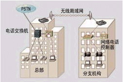 如圖2所示,兩個辦公樓之間距離較遠,不方便布線,其計算機網(wǎng)絡(luò)可以通過無線局域網(wǎng)來連接。在總部已有電話交換機系統(tǒng),這時只需在分支機構(gòu)中增加Cisco網(wǎng)絡(luò)電話控制器,布署IP電話機,然后通過總部帶語音模塊的Cisco路由器或交換機,接入總部的電話交換機,分支機構(gòu)就可以享用總部的電話中繼線路,與總部一樣自由地使用電話系統(tǒng)。