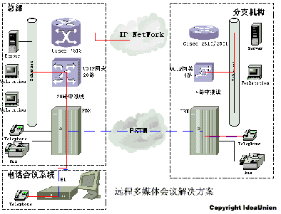 圖中紅色實(shí)線(xiàn)表示通過(guò)IP網(wǎng)絡(luò)傳輸語(yǔ)音的線(xiàn)路,藍(lán)色虛線(xiàn)表示通過(guò)PSTN傳輸語(yǔ)音的線(xiàn)路。由于通過(guò)IP網(wǎng)絡(luò)沒(méi)有使用額外的長(zhǎng)途線(xiàn)路,所以降低了遠(yuǎn)程會(huì)議系統(tǒng)的運(yùn)行成本。同時(shí)VoIP傳輸系統(tǒng)支持普通的長(zhǎng)途電話(huà)呼叫,為客戶(hù)節(jié)省長(zhǎng)途電話(huà)開(kāi)支。