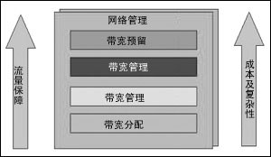 如圖所示,網(wǎng)絡(luò)管理貫穿于四個模塊建立過程中。特定的組件應(yīng)針對網(wǎng)絡(luò)基礎(chǔ)設(shè)施的特定部分而實施。具體實施時,應(yīng)首先從帶寬分配模塊開始,然后逐個上移。實施的模塊越多,保證的品質(zhì)會越高,但同時也增加了管理的復(fù)雜性,加大了維護(hù)成本。