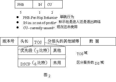 QoS的業(yè)務區(qū)分結構使用IPV4報頭中的業(yè)務類型(TOS)字段,并將8位TOS字段重新命名,作為DS字段,其中6位可供目前使用,其余2位以備將來使用。該字段可以按照預先確定好的規(guī)則加以定義,使下行節(jié)點通過識別這個字段,獲取足夠的信息來處理到達輸入端口的數(shù)據(jù)包并將他們正確地轉發(fā)給下一跳的路由器。這里需要注意的是在IPV4網(wǎng)中所定義的TOS字段與在Diff-Serv中的DS字段不同。TOS字段的定義如圖2所示。圖IPV4報頭中TOS字段定義Diff-Serv充分考慮了IP網(wǎng)絡本身靈活,可擴展性強的特點,將復雜的服務質(zhì)量保證通過DS字段轉換為先進的單跳行為,從而大大減少了信令的工作。