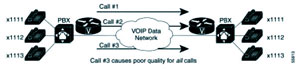 網(wǎng)絡中,話音網(wǎng)關路由器并不了解網(wǎng)絡中的狀況,包括:網(wǎng)絡的鏈路資源是否已經(jīng)飽和及網(wǎng)絡延遲,丟包率和網(wǎng)絡抖動等參數(shù)是否可以滿足話音應用的需求。如果在不能夠保證網(wǎng)絡可以提供足夠的資源保證話音質(zhì)量的情況下,建立新的通話鏈路可能影響已經(jīng)建立的鏈路,或者是降低所有的通話話音質(zhì)量。如圖三,如果廣域網(wǎng)的帶寬只能容納兩個語音的呼叫,第三個呼叫的建立會導致所有的呼叫質(zhì)量下降。在這種情況下,拒絕呼叫的建立好過建立一條沒有質(zhì)量保證的鏈路。