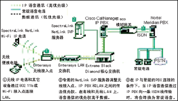 PBX,利用IP將一些遠(yuǎn)程設(shè)備與一臺(tái)Nortel的Meridian PBX連接起來,構(gòu)成語音網(wǎng)絡(luò)。在USCUH選擇為醫(yī)護(hù)人員配發(fā)WLAN電話時(shí),兩個(gè)網(wǎng)絡(luò)合并到了一起。為保證語音質(zhì)量,醫(yī)院利用SpectraLink的NetLink