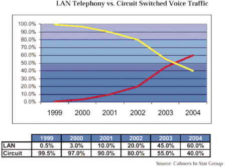 Group的資料顯示,LAN Telephone與Circuit Switched Voice Traffic比較圖,呈現(xiàn)數(shù)據(jù)網(wǎng)絡的占有率將在二至三年后,首度超越語音網(wǎng)絡的流量占有率。因此,不論是盤據(jù)傳統(tǒng)電信市場大廠如Lucent及Nortel,或是代表網(wǎng)絡新興勢力的Cisco,也都在積極爭搶這塊新領域的主導權(quán)。于是,有人說,「IP