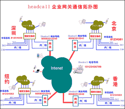 5,傳統(tǒng)的固話或手機(jī)也可通過當(dāng)?shù)氐腍eadcall的語(yǔ)音網(wǎng)關(guān)撥打全球的headcall電話及另一國(guó)家或地區(qū)的企業(yè)(有Headcall語(yǔ)音網(wǎng)關(guān))的總機(jī),這部分的費(fèi)用除了你要向當(dāng)?shù)仉娦沤患{市話費(fèi)外,其余都為零。(PSTN――Headcall)
