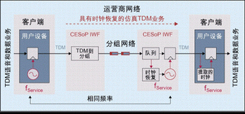 在任何通過分組實(shí)現(xiàn)電路交換的技術(shù)中,最關(guān)鍵的問題之一就是時(shí)鐘恢復(fù)(見圖3)。例如,在兩個(gè)客戶端之間使用專用租借線路通過運(yùn)營商分組網(wǎng)絡(luò)上的仿真鏈路進(jìn)行連接,則客戶TDM業(yè)務(wù)的頻率fservice必須在分組網(wǎng)絡(luò)的出口處精確地重新生成。長時(shí)間的頻率不匹配將導(dǎo)致分組網(wǎng)絡(luò)出口處形成等待隊(duì)列,如果重新生成的時(shí)鐘比原時(shí)鐘慢,則緩沖器被填滿,反之則會被清空。這兩種情況都會造成數(shù)據(jù)丟失和服務(wù)質(zhì)量下降。