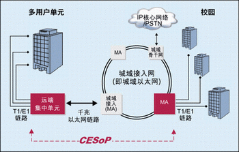 對于擁有眾多用戶的樓宇或校園業(yè)務(wù),運(yùn)營商可能需要在靠近客戶的地方裝設(shè)遠(yuǎn)端集中器。遠(yuǎn)端集中器集中提供給該樓宇內(nèi)客戶的TDM和/或分組業(yè)務(wù),使用電路仿真并通過點(diǎn)到點(diǎn)連接將業(yè)務(wù)傳回最近的城域網(wǎng)絡(luò)接入點(diǎn)。