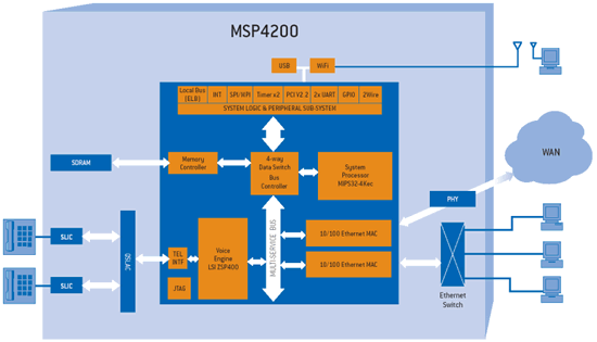 PMC-Sierra VoIP WiFi寬帶路由器方案的核心是MSP4200(見(jiàn)圖),MSP4200支持一個(gè)基于DSP的語(yǔ)音引擎,使得該MIPS處理器在管理、信令和高速IP路由任務(wù)中可發(fā)揮出最佳性能。這種架構(gòu)確保了相當(dāng)于固定線路快速以太網(wǎng)路由速度以及防火墻性能,并能同時(shí)在四個(gè)通道提供VoIP服務(wù)。另外它還有一個(gè)PCI接口以提供更多靈活性,支持各種802.11