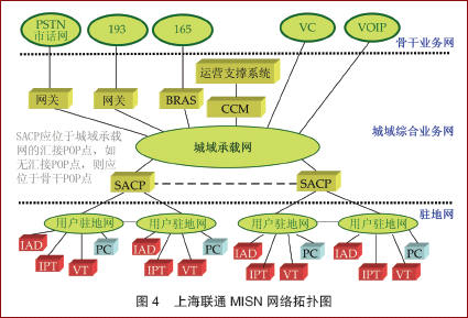 上海聯(lián)通MISN由5個(gè)部分組成(見(jiàn)圖4):(1)業(yè)務(wù)接入控制設(shè)備(SACP)。從用戶駐地網(wǎng)到城域網(wǎng)和骨務(wù)都必須通過(guò)SACP接的接入認(rèn)證、業(yè)務(wù)接入控制、網(wǎng)絡(luò)資源管理和服務(wù)質(zhì)量控制等。(2)呼叫管理控制模塊(CCM)。該模塊負(fù)責(zé)對(duì)用戶注冊(cè)的管理;通過(guò)SACP對(duì)業(yè)務(wù)接入進(jìn)行認(rèn)證和控制;與骨干業(yè)務(wù)網(wǎng)GK互通,完成各種業(yè)務(wù)的呼叫控制;與SACP一起采集計(jì)費(fèi)信息;負(fù)責(zé)控制語(yǔ)音和視頻媒體流的接入。(3)業(yè)務(wù)網(wǎng)關(guān)。聯(lián)通MISN是基于IP的分組網(wǎng),與基于電路交換的193長(zhǎng)途電話骨干網(wǎng)和本地PSTN市話網(wǎng)互通時(shí),由于媒體層面和控制信令層面都不同,因此,需要通過(guò)網(wǎng)關(guān)進(jìn)行互通。(4)BRAS設(shè)備。負(fù)責(zé)將互聯(lián)網(wǎng)接入到165網(wǎng)。(5)業(yè)務(wù)運(yùn)營(yíng)支撐系統(tǒng)。該系統(tǒng)包括維護(hù)網(wǎng)管系統(tǒng)、用戶終端管理系統(tǒng)、用戶管理(業(yè)務(wù)受理、用戶信息管理、用戶業(yè)務(wù)授權(quán)與認(rèn)證)以及本地MISN的計(jì)費(fèi)/營(yíng)賬系統(tǒng),其對(duì)上的接口是各骨干業(yè)務(wù)網(wǎng)的運(yùn)維支撐系統(tǒng)。